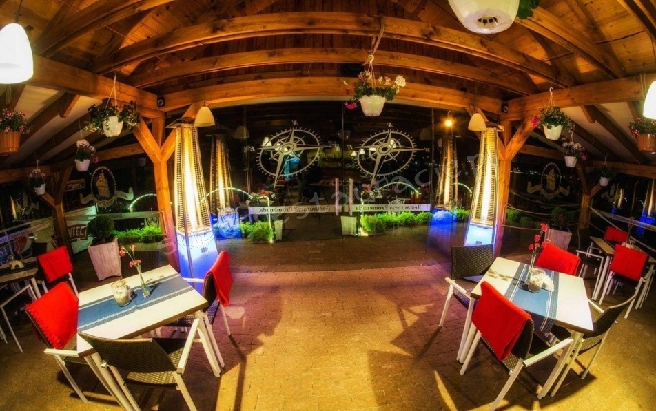 Przestronna restauracja z przeszklonym tarasem, w której istnieje możliwość wykupienia pełnego wyżywienia.